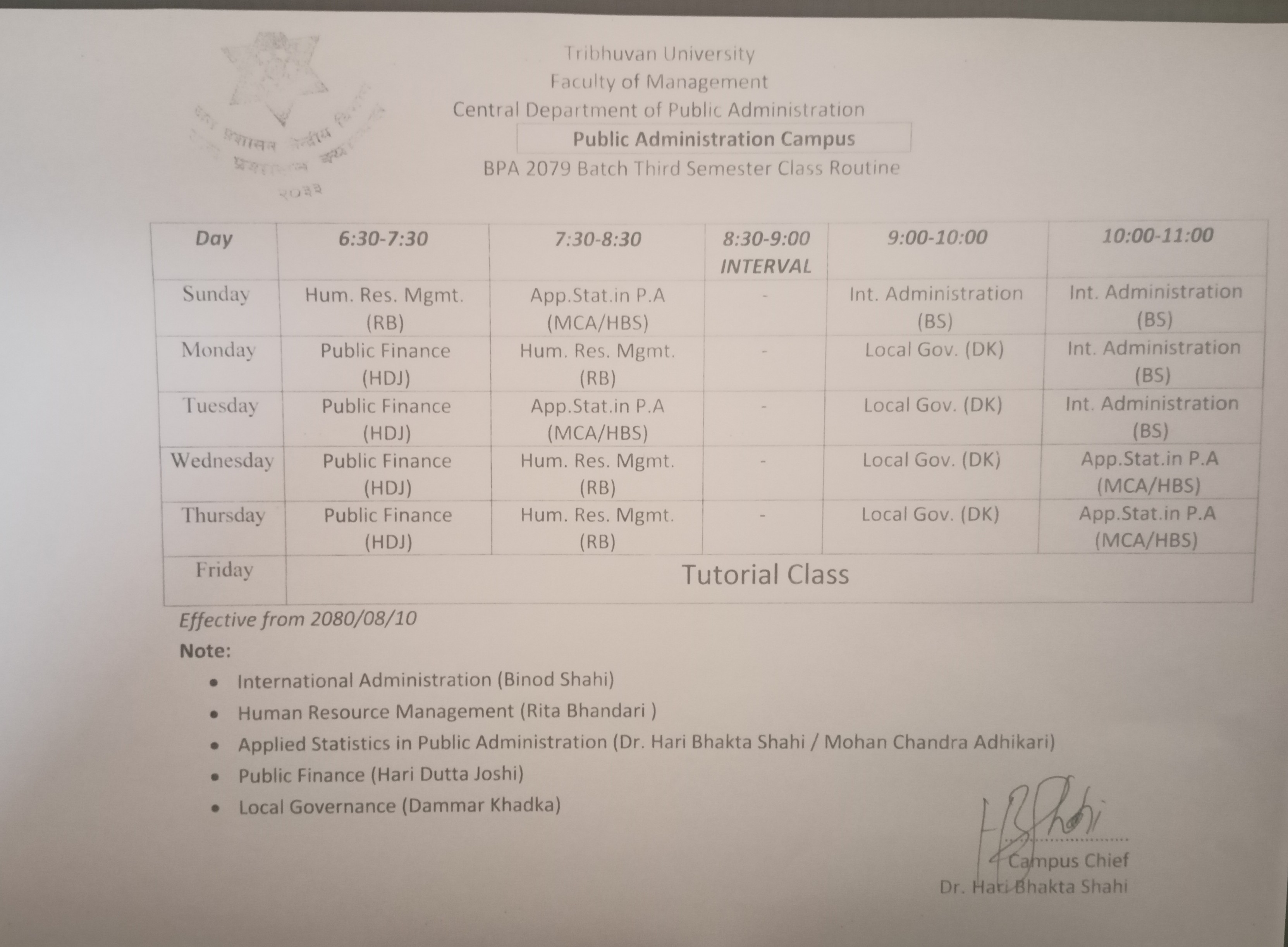 BPA Third Semester (2079 batch) Class Routine