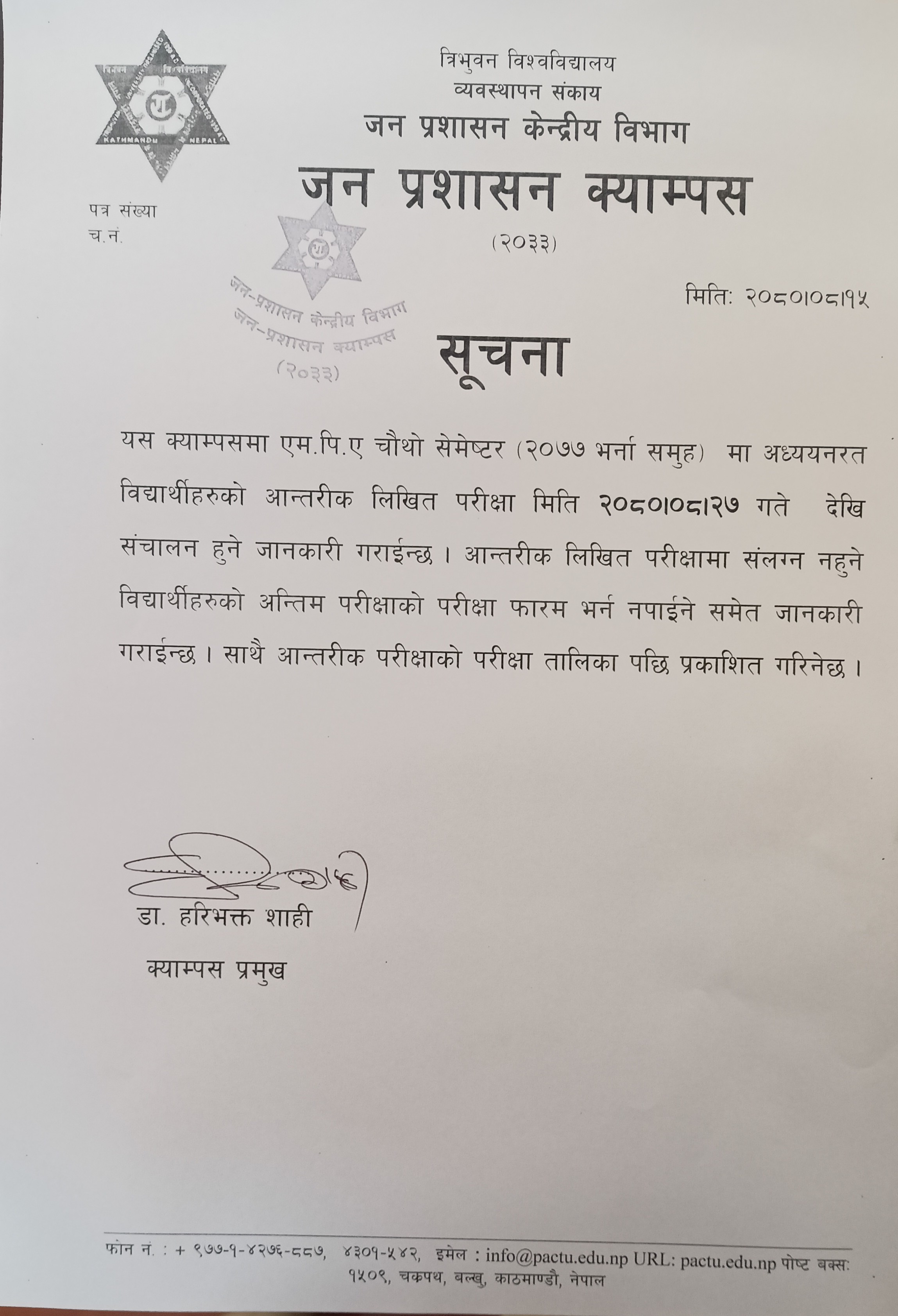 MPA 2077 Batch Fourth Semester Internal Exam Notice