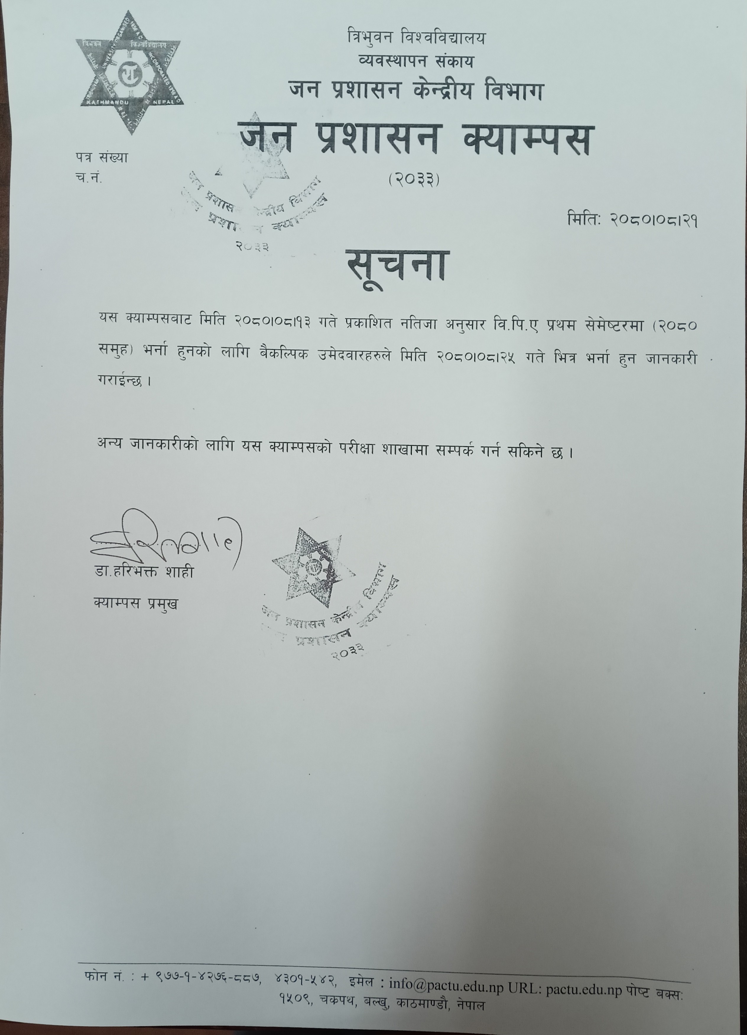 BPA 2080 batch first semester waiting list admission notice.