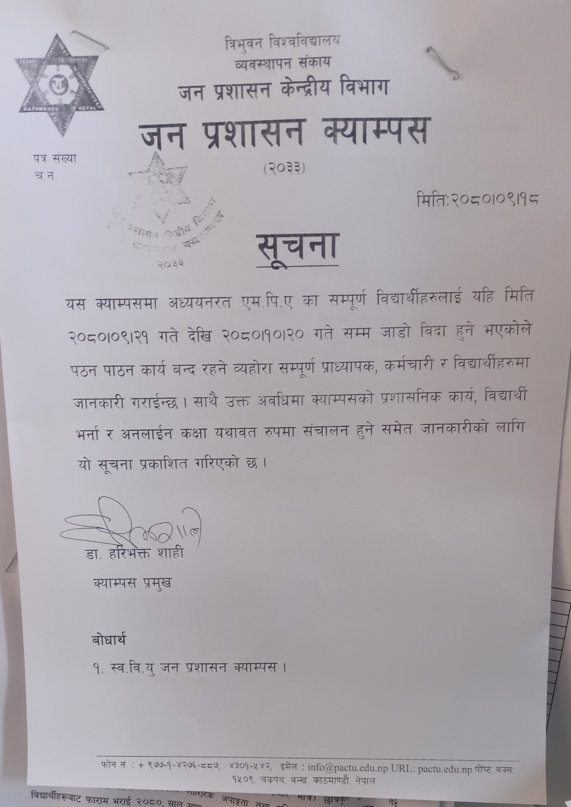 एम.पि.ए. भर्ना बर्ष २०८२ का प्रथम नियमति कक्षा संचालन सम्बन्धी सूचना