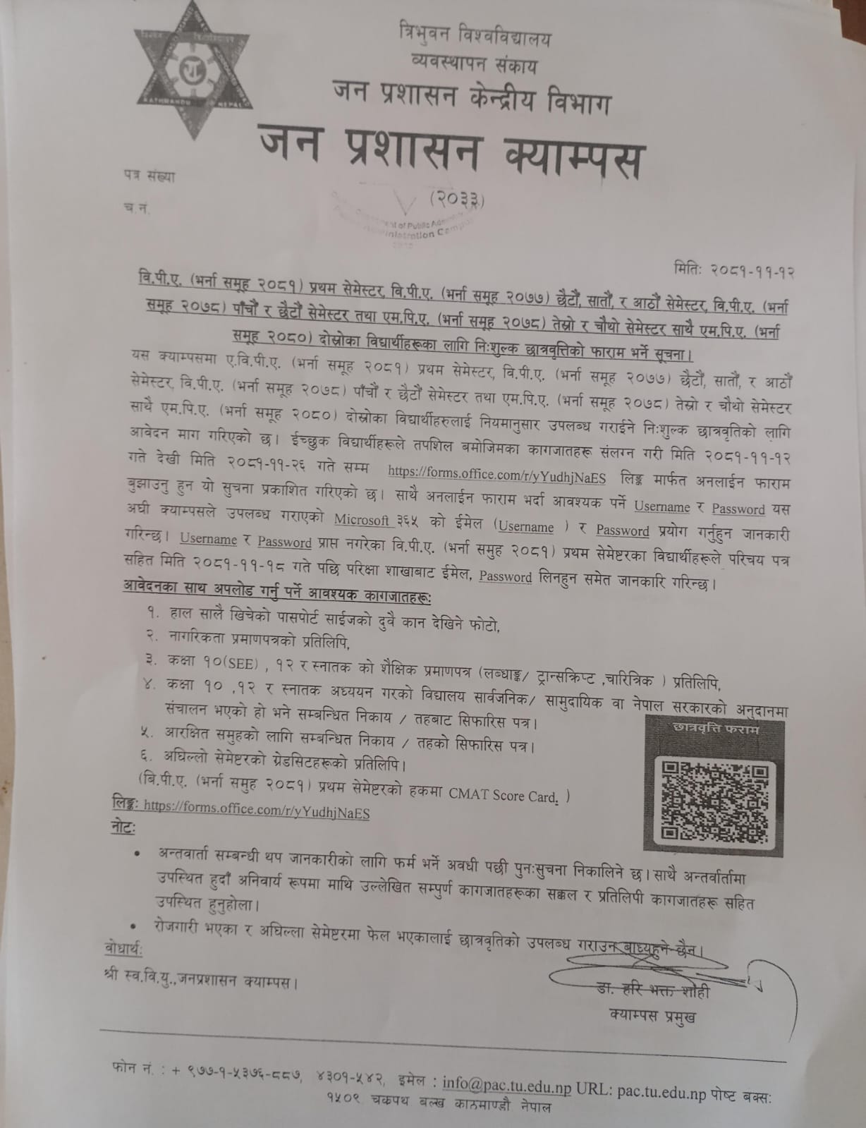 यस क्याम्पसमा .वि.पी.ए. (भर्ना समूह २०८१) प्रथम सेमेस्टर, वि.पी.ए. (भर्ना समूह २०७७) छैटौँ, सातौँ, र आठौँ सेमेस्टर, वि.पी.ए. (भर्ना समूह २०७८) पाँचौँ र छैटौँ सेमेस्टर तथा एम.पि.ए. (भर्ना समूह २०७८) तेस्रो र चौथो सेमेस्टर साथै एम.पि.ए. (भर्ना समूह २०८०) दोस्रोका विद्यार्थीहरुलाई नियमानुसार उपलब्ध गराईने निःशुल्क छात्रवृतिको लागि आवेदन माग गरिएको छ। ईच्छुक विद्यार्थीहरूले तपशिल बमोजिमका कागजातहरू संलग्न गरी मिति 2081-११-12 गते देखी मिति 2081-11-26 गते सम्म https://forms.office.com/r/yYudhjNaES लिङ्क मार्फत अनलाईन फाराम बुझाउनु हुन यो सुचना प्रकाशित गरिएको छ। साथै अनलाईन फाराम भर्दा आवश्यक पर्ने Username र Password यस अघी क्याम्पसले उपलब्ध गराएको Microsoft 365 को ईमेल (Username ) र Password प्रयोग गर्नुहुन जानकारी गरिन्छ। Username र Password प्राप्त नगरेका वि.पी.ए. (भर्ना समुह 208१) प्रथम सेमेष्टरका विद्यार्थीहरूले परिचय पत्र सहित मिति 2081-११-१8 गते पछि परिक्षा शाखाबाट ईमेल, Password लिनहुन समेत जानकारि गरिन्छ।