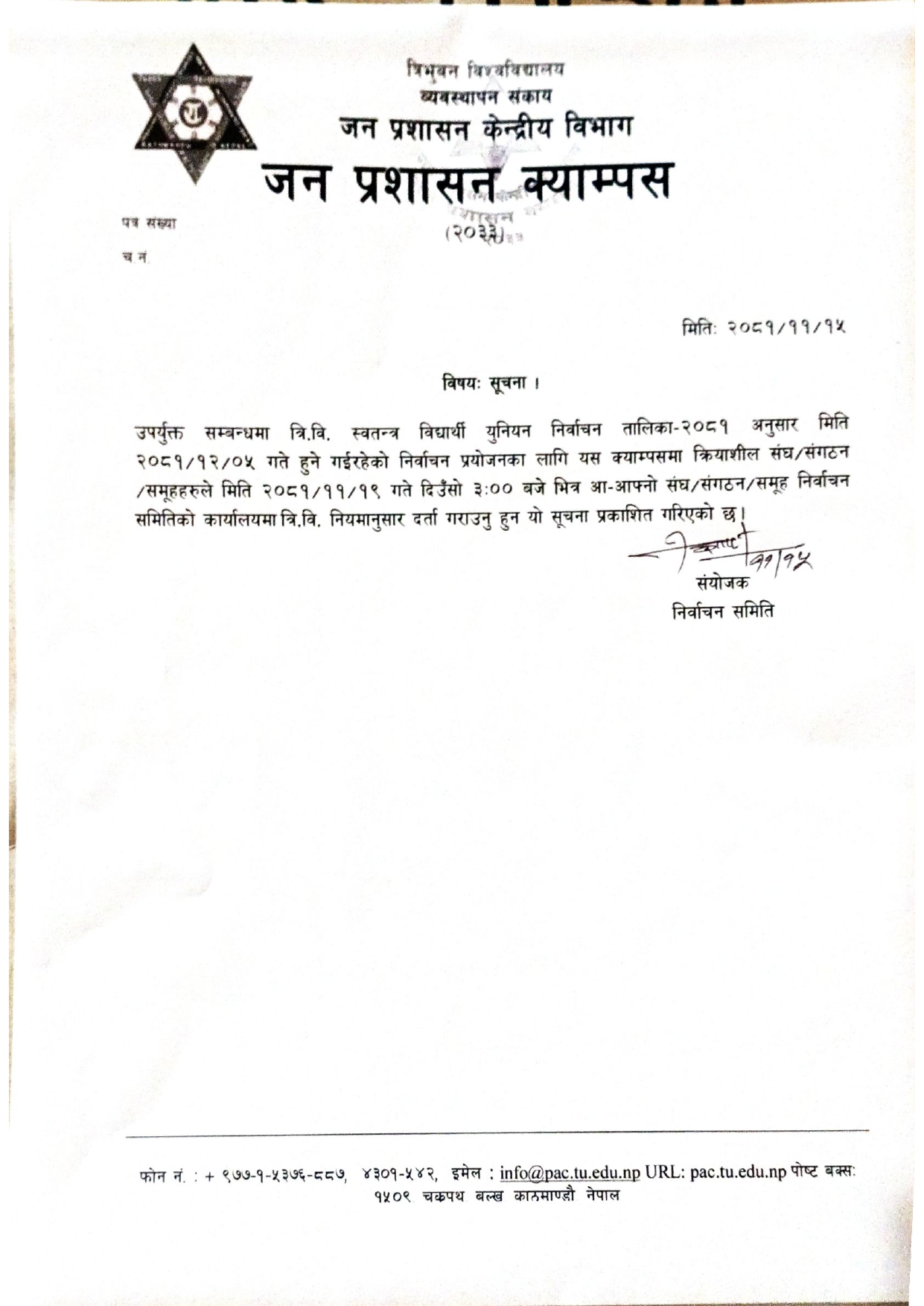 उपर्युक्त सम्बन्धमा त्रि.वि. स्वतन्त्र विद्यार्थी युनियन निर्वाचन तालिका-२०८१ अनुसार मिति २०८१/१२/०५ गते हुने गईरहेको निर्वाचन प्रयोजनका लागि यस क्याम्पसमा क्रियाशील संघ/संगठन /समूहहरुले मिति २०८१/११/१९ गते दिउँसो ३:०० बजे भित्र आ-आफ्नो संघ/संगठन/समूह निर्वाचन समितिको कार्यालयमा त्रि.वि. नियमानुसार दर्ता गराउनु हुन यो सूचना प्रकाशित गरिएको छ।